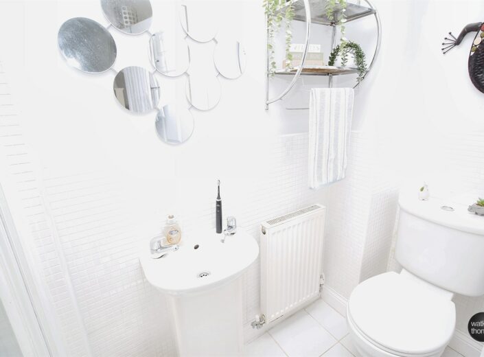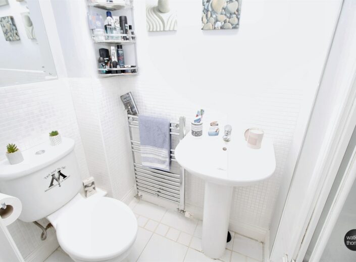 With shower cubicle with thermostatically controlled shower, low flush wc, pedestal mounted wash hand basin, heated towel rail, partially tiled wall surround, extractor fan, inset spot lights and heated towel rail.