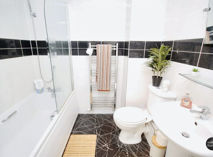 With suite comprising panel enclosed bath with thermostatically controlled shower over, low flush wc, pedestal mounted wash hand basin, extractor fan, inset spot lights, fully tiled wall surround, vinyl flooring and shaver point.