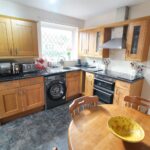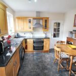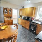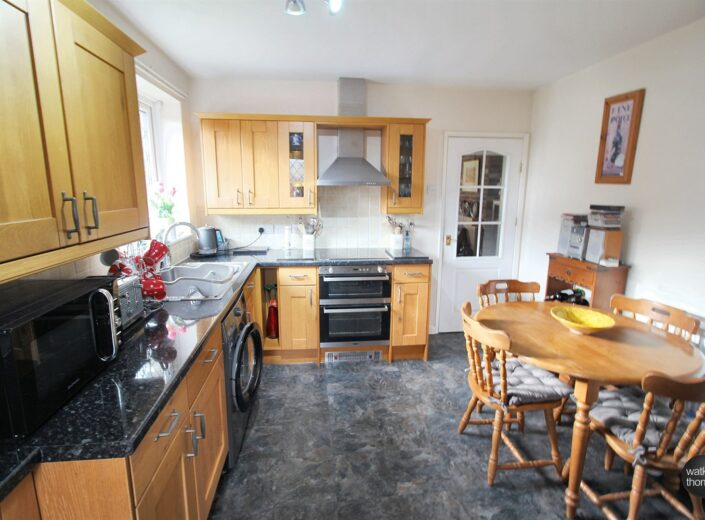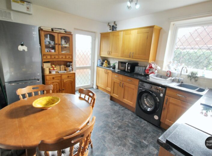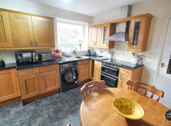 With rear aspect double glazed window, a range of units comprising stainless steel sink drainer unit with work surfaces, tiled splashbacks, base units under with matching wall units, plumbing and space for washing machine, integrated electric oven and hob with cooker hood over, space for upright fridge freezer, panelled radiator, vinyl flooring, side aspect double glazed door giving access to the driveway.