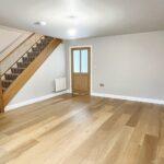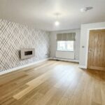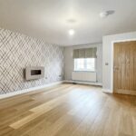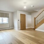 With a double glazed window to the front, stairway with wooden post and hand rail and glazed panels, wall mounted contemporary style electric fire, engineered oak flooring, two radiators and wall mounted thermostat. Oak door with glazed upper panels to;