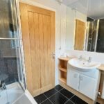With white suite comprising low level WC with wooden seat and corner wash basin with tiled courses over. Double glazed window, radiator and continuation of wood grain effect flooring.