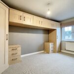 With a double glazed window to the front and with a double wardrobe cupboard, two single wardrobe cupboards and with bedside units and cabinets over a bed recess. Radiator.