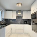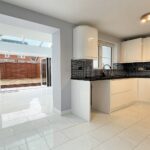 Beautifully appointed and with soft close base cupboard and drawer units to three walls with quartz working surface over, mosaic effect tile surrounds and an extensive range of matching eye level cabinets, together with concealed fridge and freezer units, recess for washing machine and with an electric oven with microwave over, four ring induction hob with stainless steel cooker hood above together with a one and a half bowl composite sink unit with drainer, flexible head tap and a wall mounted gas fired boiler, which provides central heating and domestic hot water. Central heating and domestic hot water control clock. Feature black power points, kick board lighting, radiator, two sets of ceiling light fittings and with an oak door to an under stair cupboard and with quartz floor tiles, which continue through a 4' x 4' wide opening to an;