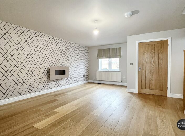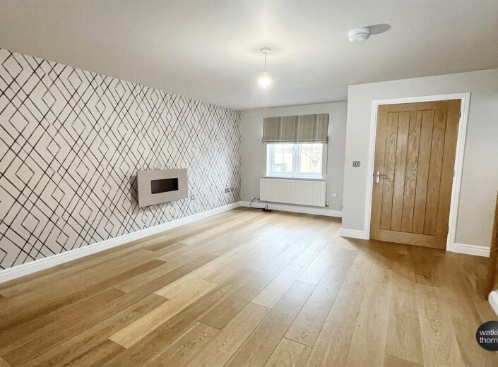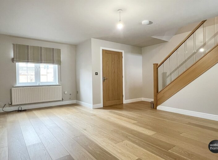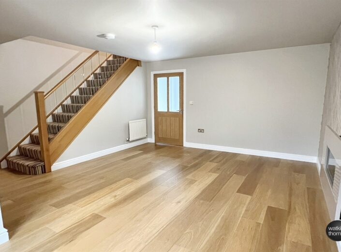 With a double glazed window to the front, stairway with wooden post and hand rail and glazed panels, wall mounted contemporary style electric fire, engineered oak flooring, two radiators and wall mounted thermostat. Oak door with glazed upper panels to;