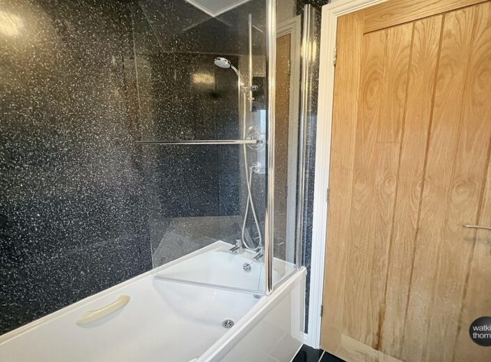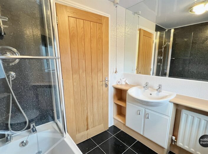 With white suite comprising bath with thermostatically controlled shower unit over and screen, 'quartz' shower boarded walls and having a low level WC and vanity wash basin with adjacent surfaces and cabinets below. Double glazed window, extensively tiled walls, radiator and quartz tiled floor.