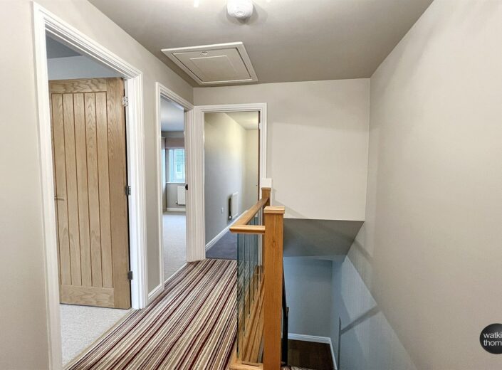 Approached over a carpeted stairway and with access hatch to loft space, feature light fitting and with oak doors with stainless steel handles to;