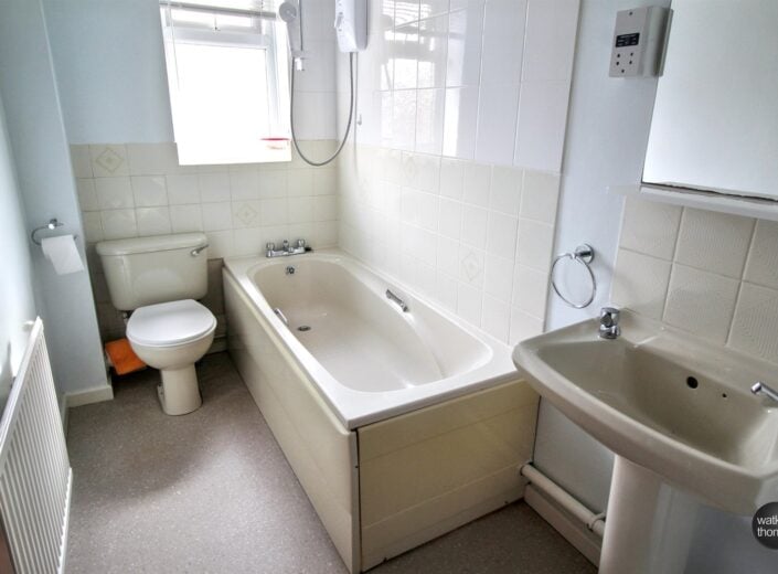 With double obscure glazed window to the front, low level wc, panel enclosed bath with Mira shower over, pedestal wash hand basin with mirror and cabinet over, shaver point, radiator and vinyl flooring.