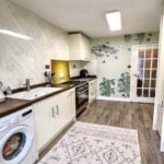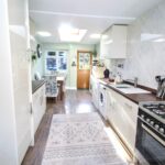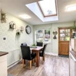 With rear aspect double glazed window, rear aspect velux sky light, rear aspect double glazed stable door to the garden, a range of units comprising sink drainer unit with work surface, splashback, base units under with matching wall units. Washing machine, dishwasher, range cooker, space for dining table and laminated flooring.