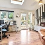 With side and rear aspect double glazed windows, two panelled radiators, laminated flooring, rear aspect velux sky light, two wall lights, double glazed door to the rear garden with glazed window to the side.