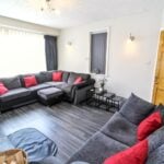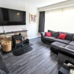 With front and side aspect double glazed windows, wood burning stove with stone surround, panelled radiator, two wall lights and laminated flooring.