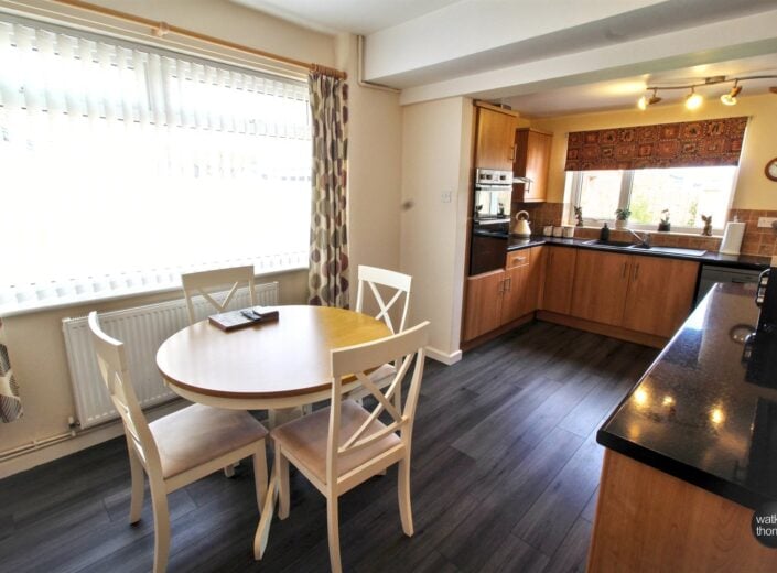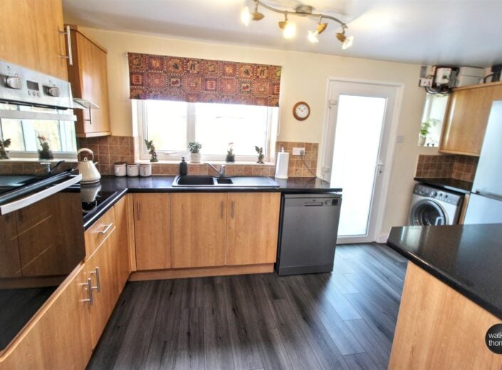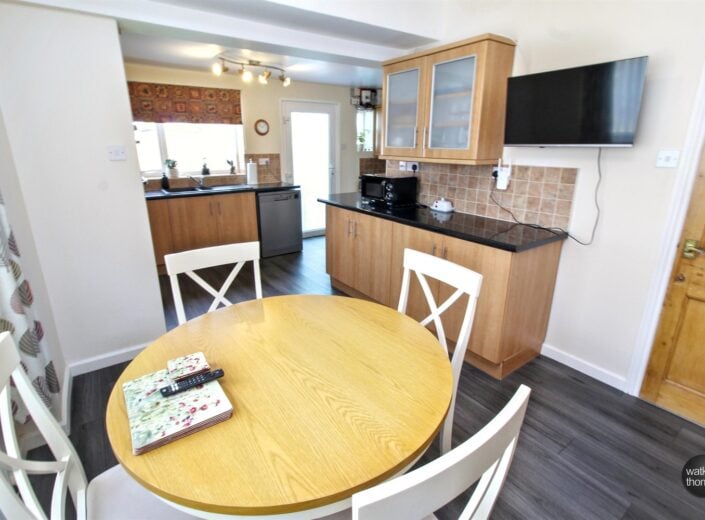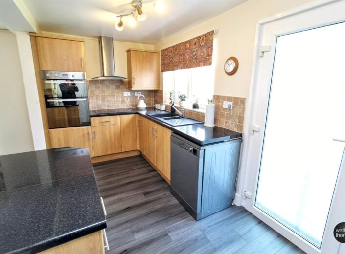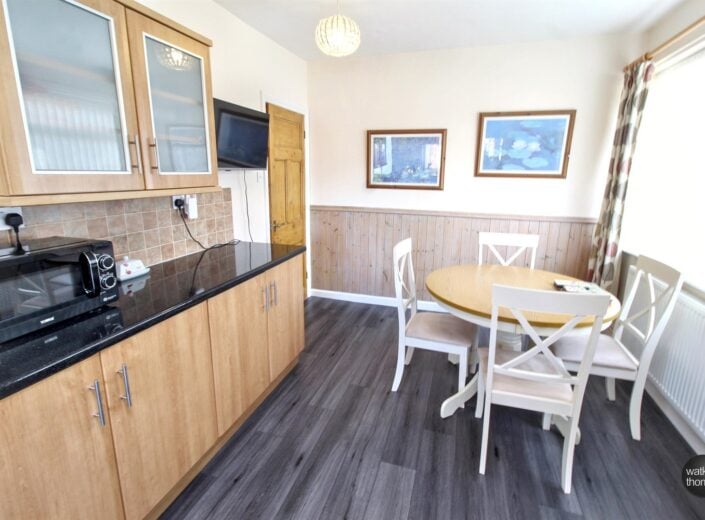 With side aspect double glazed window, panelled radiator, work surface with tiled splash backs, wall and base mounted units, smoke alarm, laminated flooring and access to the kitchen.