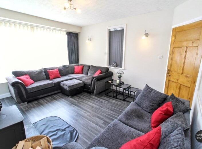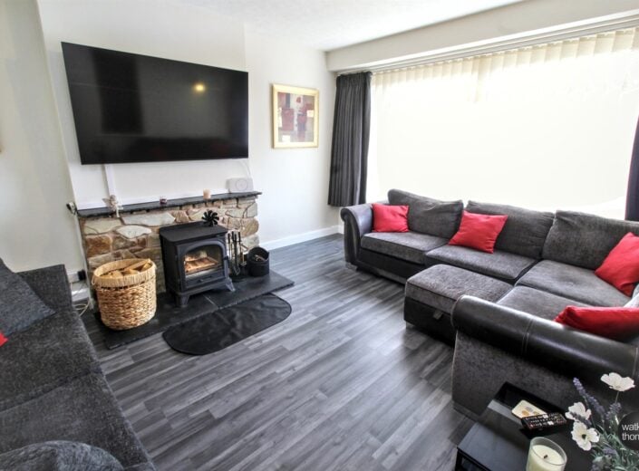 With front and side aspect double glazed windows, wood burning stove with stone surround, panelled radiator, two wall lights and laminated flooring.