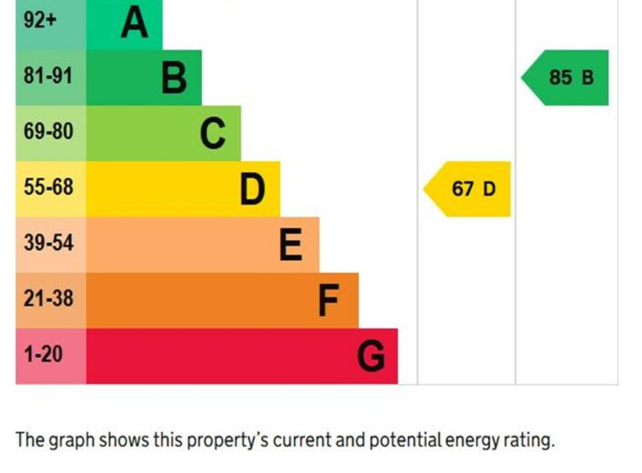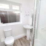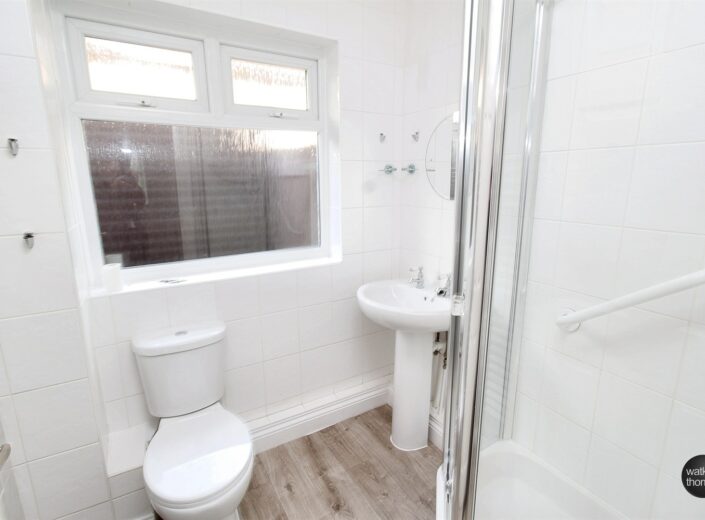 With side aspect double glazed window, shower cubicle with glass shower screen, electric shower, fully tiled wall surround, heated towel rail, low flush wc, pedestal mounted wash hand basin, shaver point and vinyl flooring.