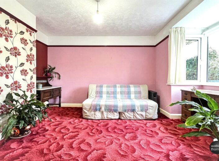 With a square, double glazed bay window at the front, double glazed window to the side, picture rail and with a timber fire surround with quarry tile base.