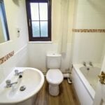 With side aspect double glazed window, suite comprising panel enclosed bath with electric shower over, low flush WC, pedestal mounted wash hand basin, shaver point, partially tiled wall surround, wall mounted heater, extractor fan and vinyl flooring.