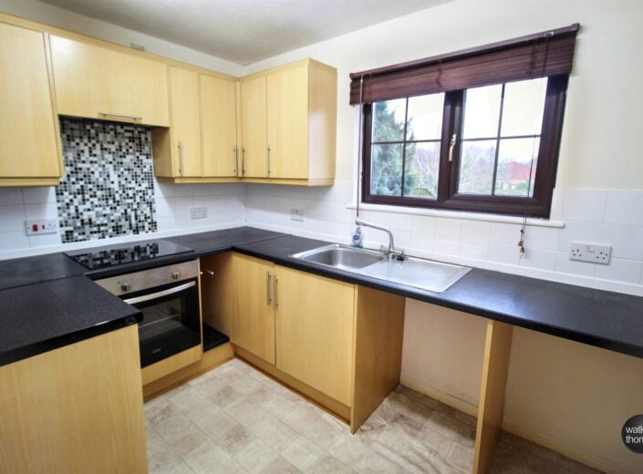 With front aspect double glazed window, a range of units comprising stainless steel sink drainer unit, work surface with tiled splashbacks, base units under with matching wall units, integrated electric oven and hob with cooker hood over, plumbing and space for washing machine, space for upright fridge/freezer and vinyl flooring.