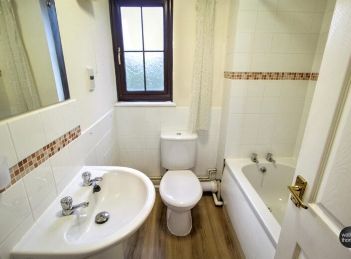 With side aspect double glazed window, suite comprising panel enclosed bath with electric shower over, low flush WC, pedestal mounted wash hand basin, shaver point, partially tiled wall surround, wall mounted heater, extractor fan and vinyl flooring.