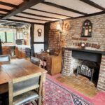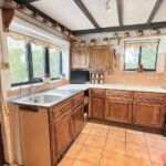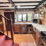With wood fronted base cupboards and drawer units with roll edge working surface over, tiled surrounds and matching eye level cupboards. Part tiled walls, leaded double glazed windows to two aspects, built in single drainer sink unit with drainer, recess with space for cooker, tiled floor, corner cupboard, door to rear porch and door to inner lobby. Within the kitchen area there are exposed wall and ceiling timbers and an under-stair storage space.