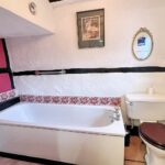 With a white suite comprising bath, low level WC and pedestal wash basin. Exposed wall timbers, radiator, tiled floor, leaded double glazed window and wall mounted boiler which provides central heating and domestic hot water.