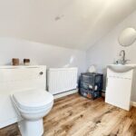 With low level WC, wash basin with mixer tap, radiator, wood laminate flooring and door to an eaves storage cupboard. Extractor vent.