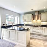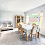 To include a stairwell with wooden handrail to the first floor. Run of sunken ceiling lights, radiator, under stair store cupboard and with a double glazed sliding patio door opening to and overlooking the front garden. With solid oak doors with stainless steel handles to the living room/snug, two bedrooms and bathroom and with feature doors with vertical glazed panels to the kitchen/dining room and the;
