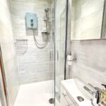 With tiled surrounds, part textured and having suite comprising shower cubicle, folding door and an electric shower unit, wash basin with a cupboard below and mixer tap together with low level WC. Double glazed window, sunken ceiling lights, ladder type radiator and ceramic floor tiles.