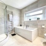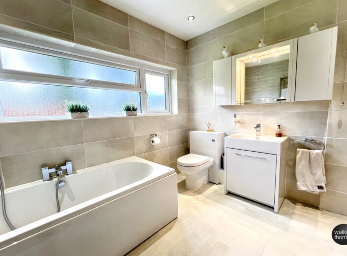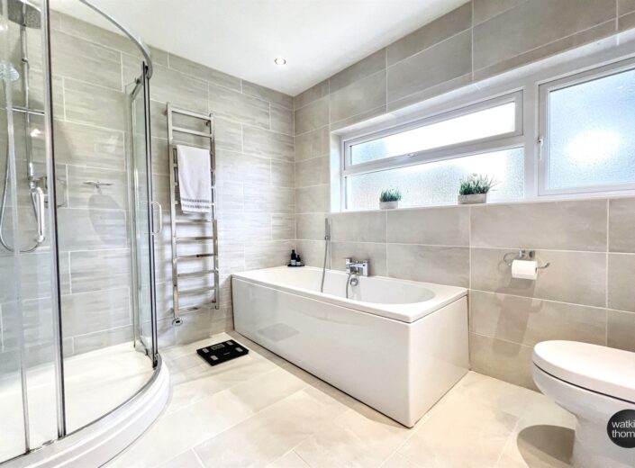 Superbly appointed and with fully tiled walls, part with texture finished and having white suite comprising bath with mixer tap, wide corner shower cubicle with thermostatically controlled twin headed shower unit, low level WC and wash basin with mixer tap and cupboard below. Sunken ceiling lights, with a contemporary style radiator and with a further summer electric towel rail and ceramic floor tiles.