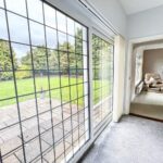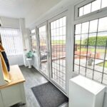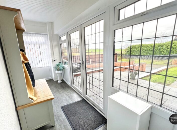 Enclosed entrance area approached through a pair of leaded double glazed doors with adjacent leaded windows with woodgrain effect ceramic tiles. Double glazed door to;