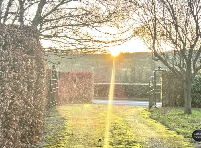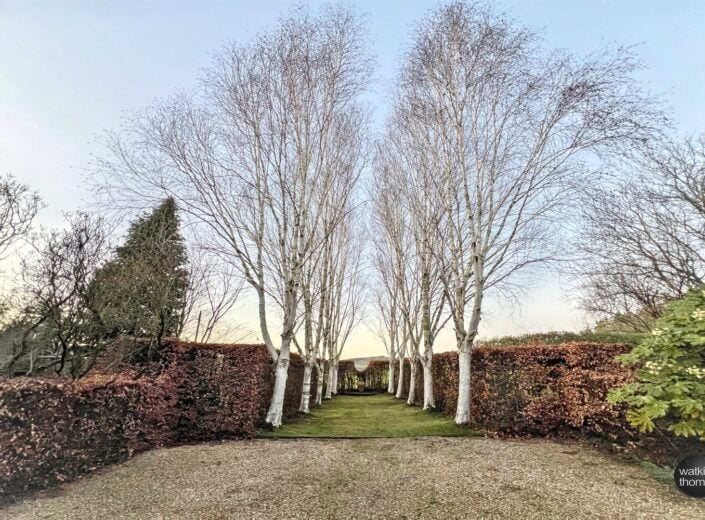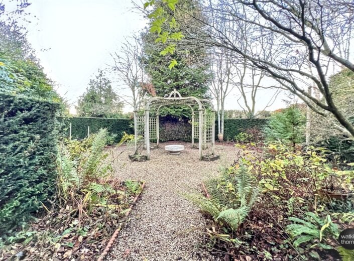 The property is approached over a splayed drive which runs to a pair of double wrought iron gates in a beach hedge which runs across the frontage and along the drive. The front gardens are lawned and interspersed with a wide variety of specimen trees and continue through formal lawns and a square of lawn at the front of the residence is bounded part by wrought iron work with a chipping stone pathway around an ornamental pond. At the side of the property there is a further lawned garden area with central circular patio, an area enclosed to the right by a dense evergreen hedge and by a row of mature firs with a pathway. At the side of the residence there are further lawns with a pergola walkway. Through the pergola there is a stone pathway with brick edge which runs to a feature bay. To the rear of the property there are further gardens with mature trees and the grounds continue up and behind the residence to a further wooded area. The garden and grounds run to about two acres and there is also a greenhouse, an arch with climbing roses over and a parade of silver birch trees, five on each side with a viewing area beyond. The driveway runs to a parking and turning area, off which is the garage.