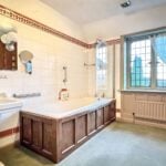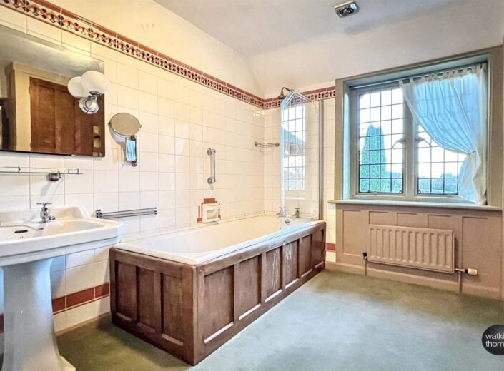 Of a classic period design with an enamel bath with timber panel and Adelphi sink unit, part tiled walls, part painted boarded walls, ladder type radiator, further radiator, leaded window overlooking the rose pergola, extractor unit and with double doors to the airing cupboard with insulated hot water cylinder, central heating and domestic hot water control clock.
