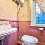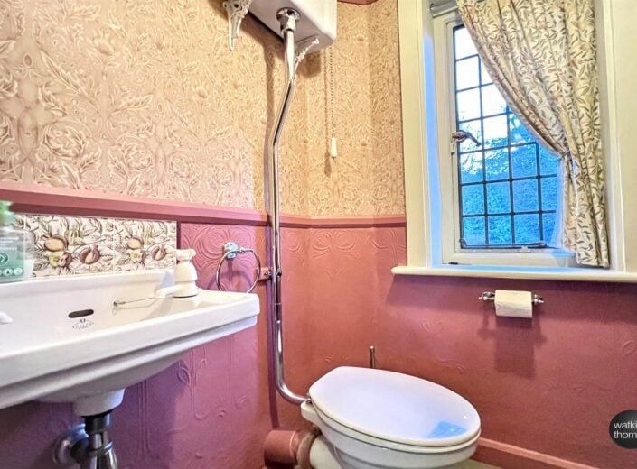 With high level WC and a wall mounted Aldelphi wash basin. Leaded window and radiator.