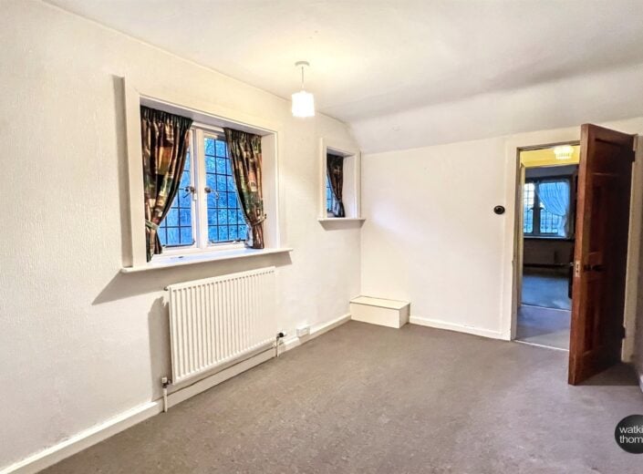 With access hatch to loft space, window seat area, leaded window overlooking the front garden, radiator and with doors to;