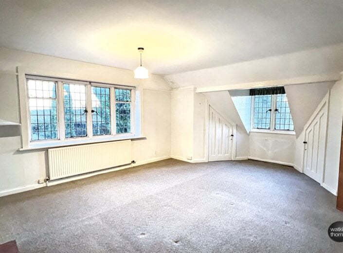 With a leaded window to the south, looking back towards the village, leaded window to the front overlooking the gardens, radiator, two sets of eaves storage cupboards and with a brick fire surround with a mantel and hearth.