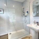 With side aspect double glazed window, shower cubicle with thermostatically controlled shower, low flush wc, pedestal mounted wash hand basin, full shower boarded surround, heated towel rail, inset spot lights, extractor fan and tiled flooring.