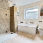 Attractively appointed and with white suite comprising bath with central mixer tap, walk in shower cubicle with thermostatically controlled twin headed shower unit and glazed screen. Pedestal wash basin and low level WC. Attractive part tiled/part shower boarded, double glazed window, extractor unit, ladder type radiator and with a door to a recessed boiler cupboard in which is housed the floor mounted gas fired boiler which provides central heating and domestic hot water.