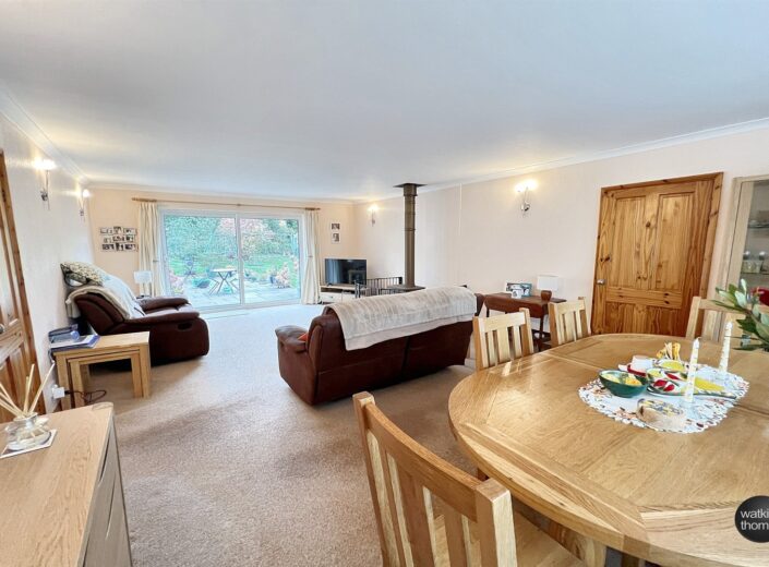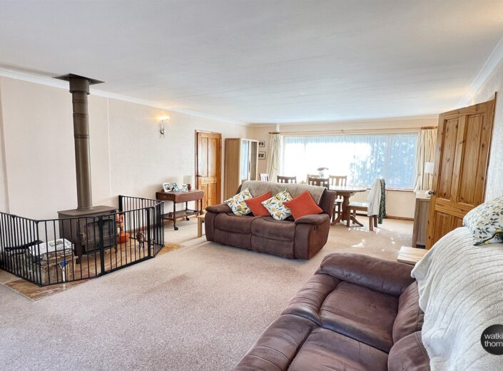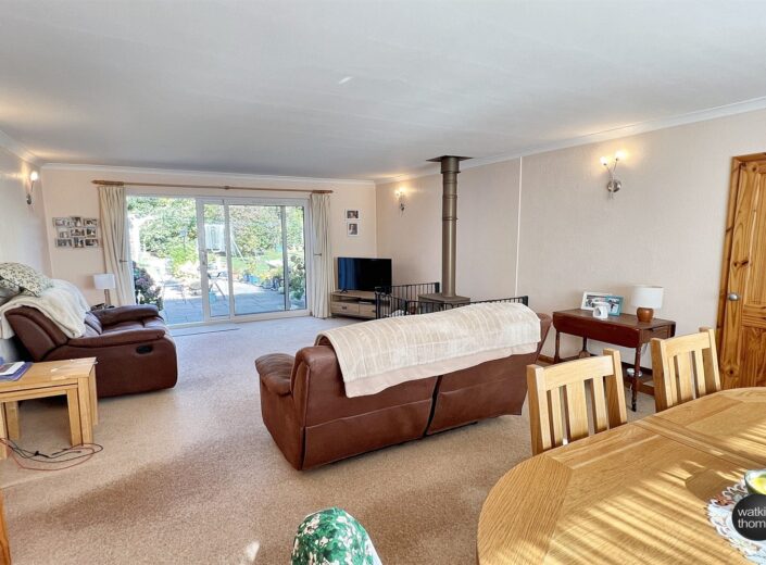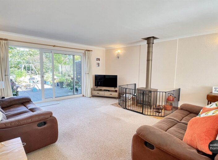 With a picture double glazed window to the front and double glazed sliding patio door opening to and overlooking the rear gardens. Coved ceiling, radiator and with a feature multi fuel stove (Clearview Vision 500) set on a tiled hearth. Wall light points. Door to;