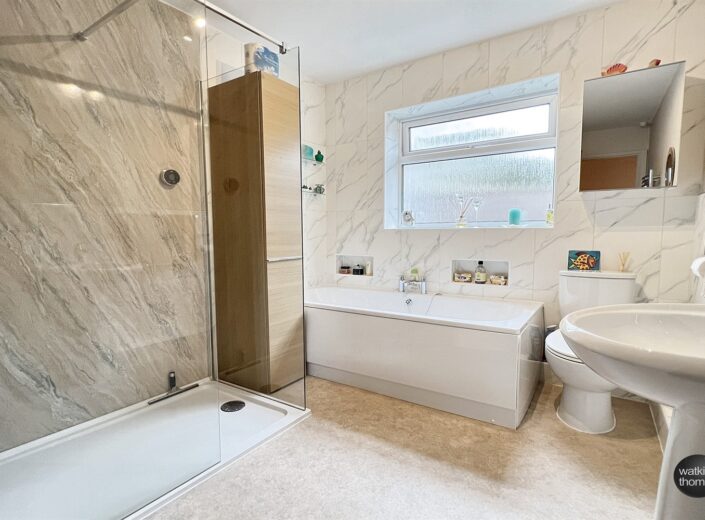Attractively appointed and with white suite comprising bath with central mixer tap, walk in shower cubicle with thermostatically controlled twin headed shower unit and glazed screen. Pedestal wash basin and low level WC. Attractive part tiled/part shower boarded, double glazed window, extractor unit, ladder type radiator and with a door to a recessed boiler cupboard in which is housed the floor mounted gas fired boiler which provides central heating and domestic hot water.